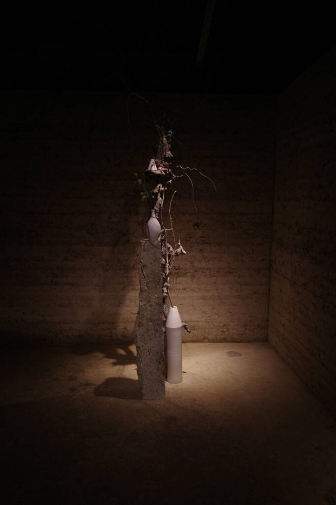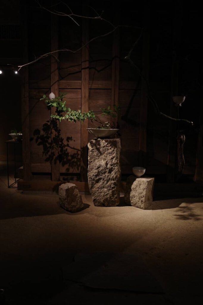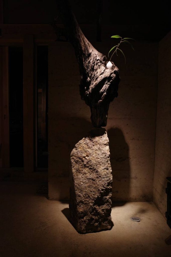 「里美窯」が運営するカフェ&ギャラリー「Satomi kiln」3周年記念に制作したオブジェ。「Satomi kiln」の特徴である“庭”のイメージを取り入れたいと考え、庭石に使われている秋保石と流木を使用しました。自然の素材を使い、庭と一体感がある室内空間を演出しています。「里美窯」で焼かれた白い器は、黒い流木のくぼみに配置。作品が浮き上がって見えるような配色としました。