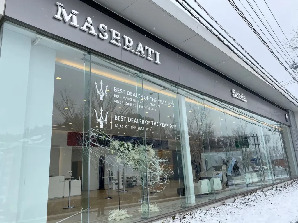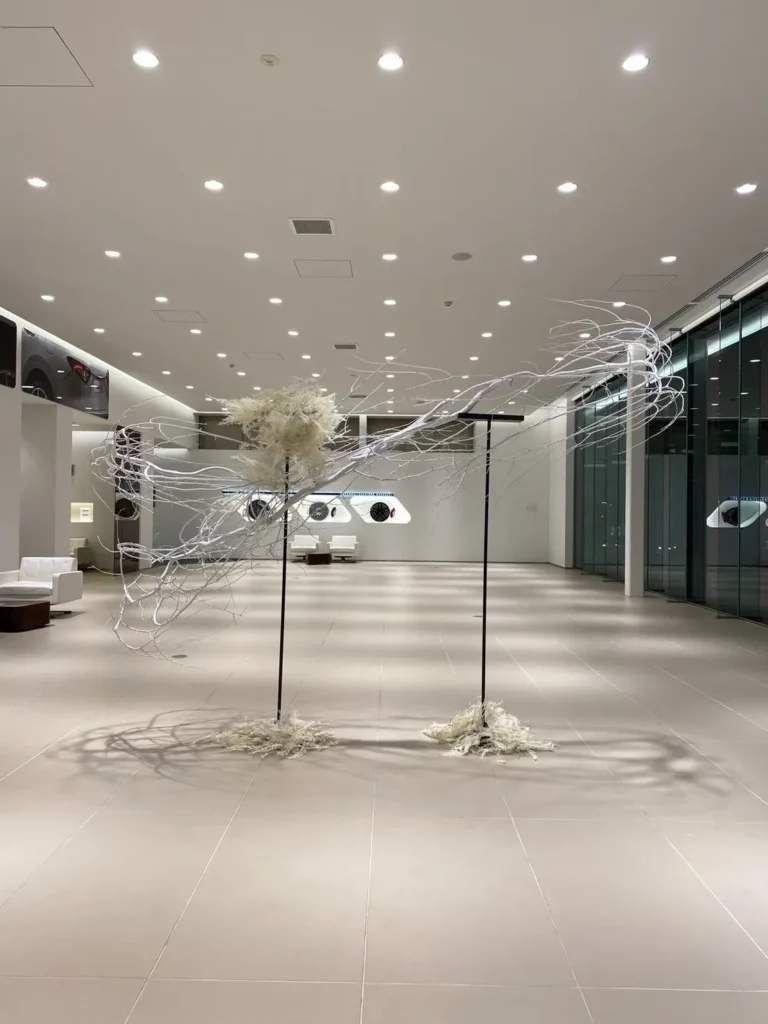 年に数回、マセラティ 仙台のショールームにオブジェを納品しています。写真は、バタフライドアの新車をイメージしたもの。柳の枝を使って、白い蝶を表現しました。枝は漂白し、無機質で上品な雰囲気にまとめています。高級な空間にフィットするよう、オブジェを展示するスタンドも自作しました。