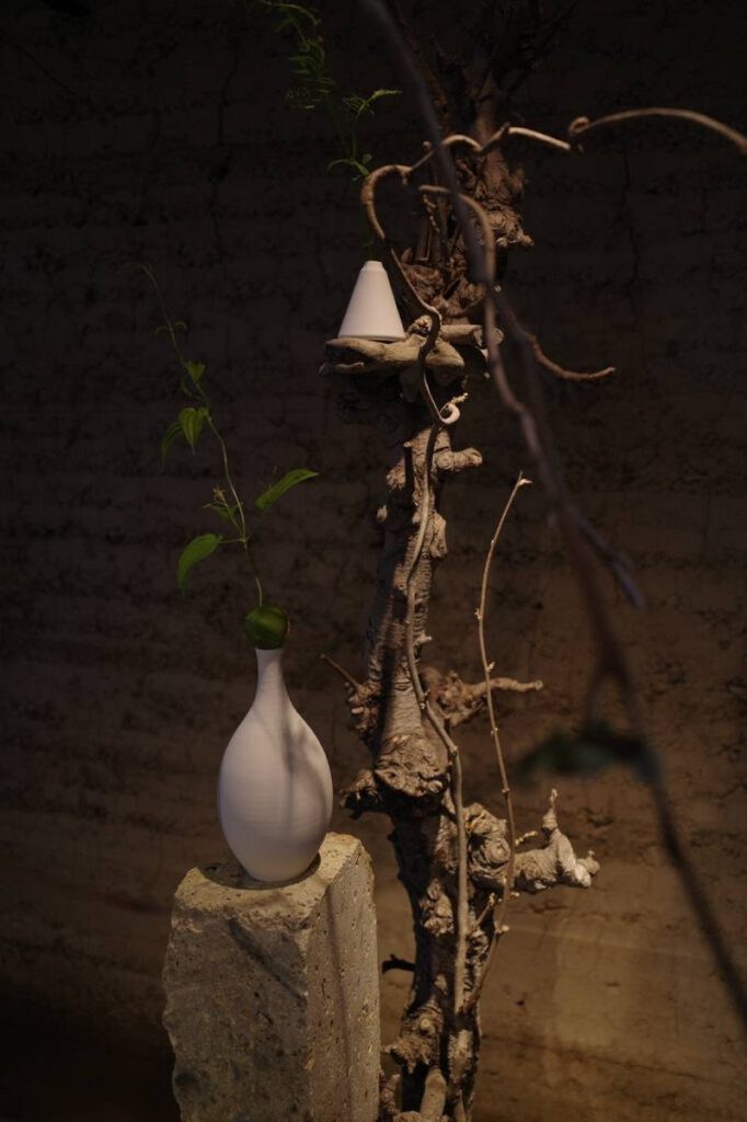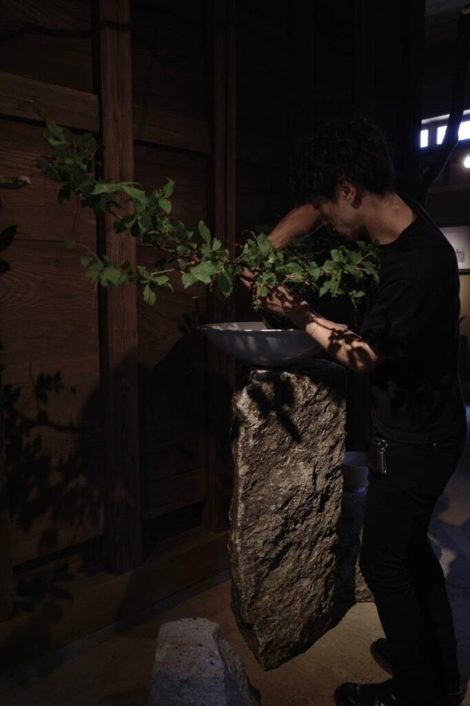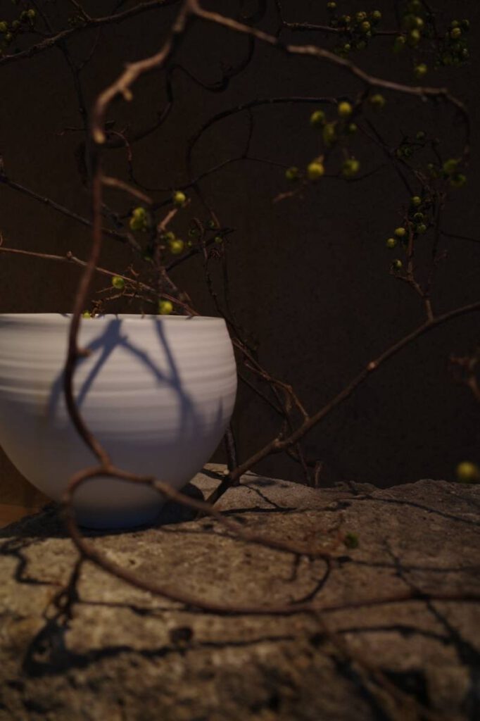 「里美窯」が運営するカフェ&ギャラリー「Satomi kiln」3周年記念に制作したオブジェ。「Satomi kiln」の特徴である“庭”のイメージを取り入れたいと考え、庭石に使われている秋保石と流木を使用しました。自然の素材を使い、庭と一体感がある室内空間を演出しています。「里美窯」で焼かれた白い器は、黒い流木のくぼみに配置。作品が浮き上がって見えるような配色としました。