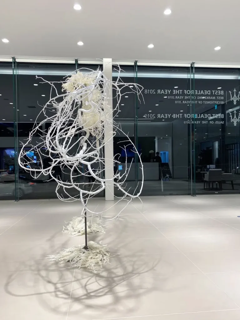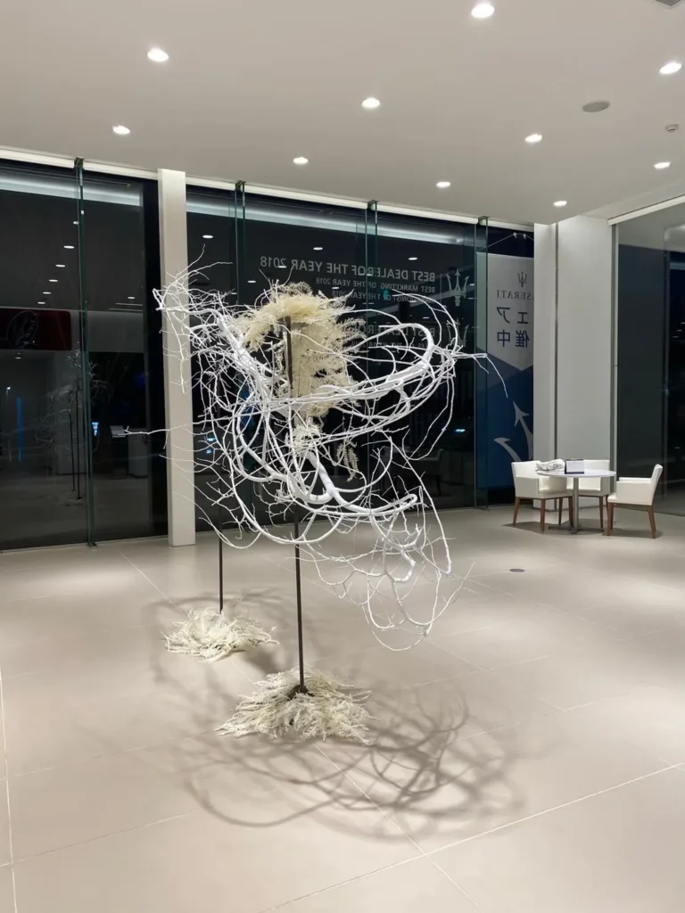 年に数回、マセラティ 仙台のショールームにオブジェを納品しています。写真は、バタフライドアの新車をイメージしたもの。柳の枝を使って、白い蝶を表現しました。枝は漂白し、無機質で上品な雰囲気にまとめています。高級な空間にフィットするよう、オブジェを展示するスタンドも自作しました。